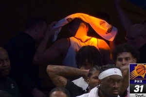 太阳球员格雷森·阿伦在进攻中受伤,据太阳队记Amanda Pflugrad报道,阿伦在离场时捂着自己的左腿筋。