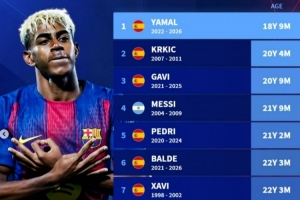 体育资讯4月15日讯 在欧冠1/4决赛次回合,巴萨2-1击败马竞,亚马尔达成巴萨生涯150次出场里程碑。德转盘点了巴萨队史达成150次出场最年轻纪录榜,具体如下: