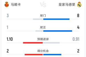 体育资讯04月04日讯 西甲第30轮马略卡vs皇马上半场战罢,马略卡暂时1-0领先,以下为双方半场数据对比: